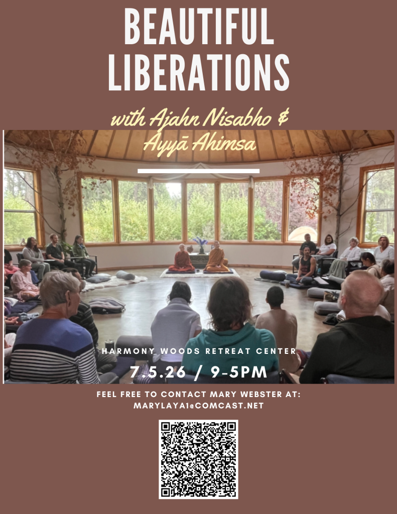 Join Ajahn Nisabho and Ayyā Ahiṃsā for a day of meditation and teachings, 9 am – 5 pm on Sunday, July 5th, at Harmony Woods Retreat Center outside of Spokane, WA (11507 S Keeney Rd, Spokane, WA). Note that Clear Mountain’s weekly Saturday gathering in Seattle will still be held as usual.