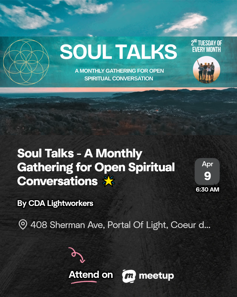 Soul Talks is a monthly meetup centered on open spiritual conversation. It’s a welcoming space to share experiences, listen deeply, and explore spirituality with others in a gentle, supportive way.