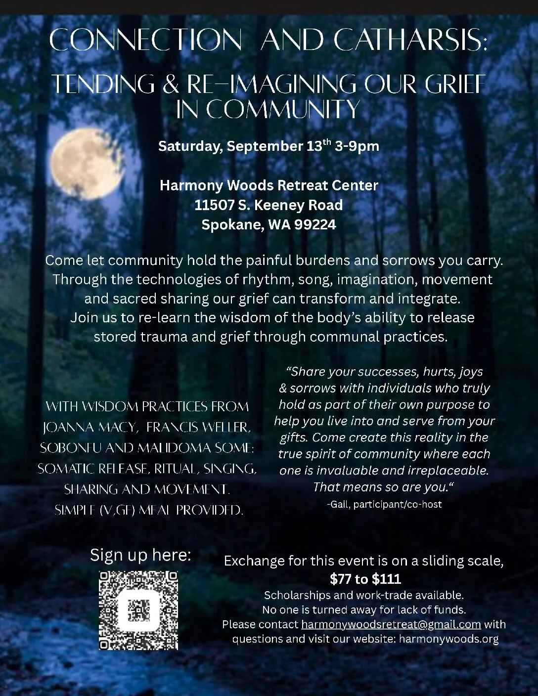The price for this event will be on a sliding scale, from $77 to $111. Scholarships and work trades available: no one turned away for lack of funds. Please register here or use the QR code to register.