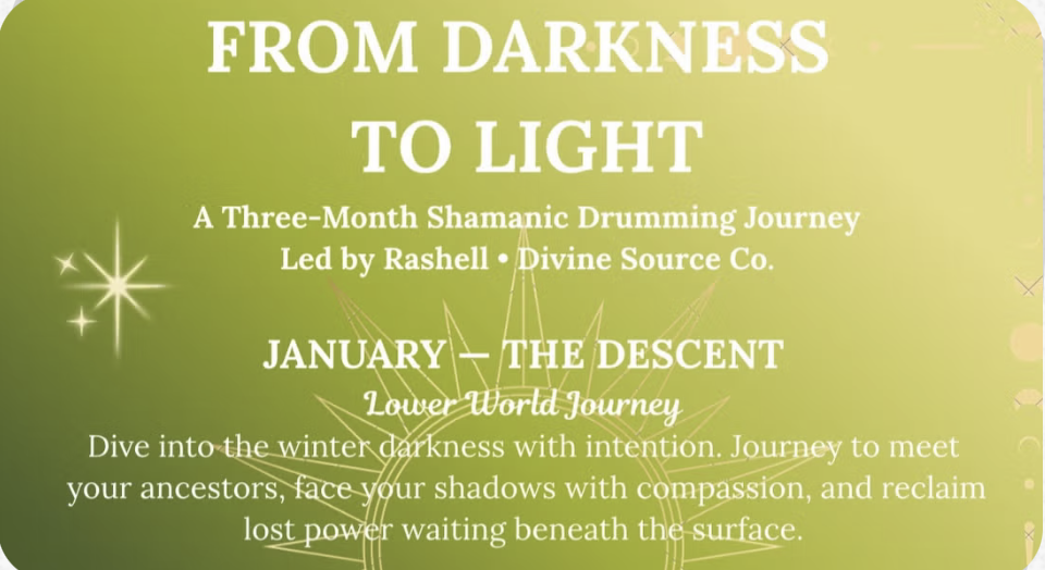 Join this 3-Month Shamanic Drumming Series: From Darkness to Light hosted by Rashell Ver Valin with Divine Source Co: January's theme will be Lower World Journey 🌀